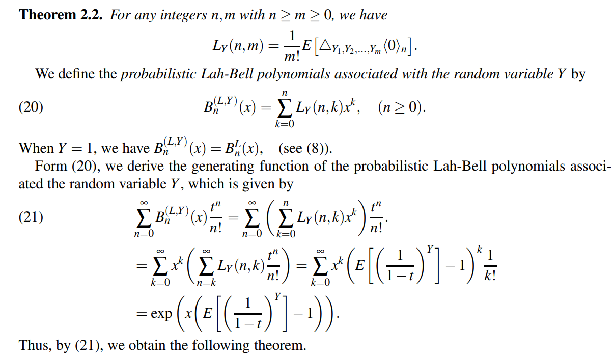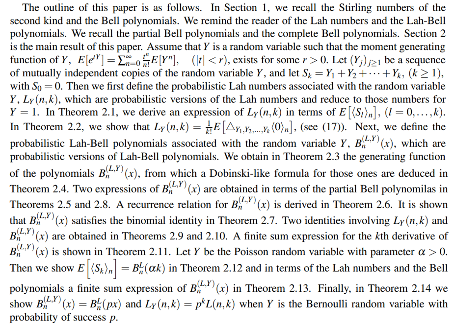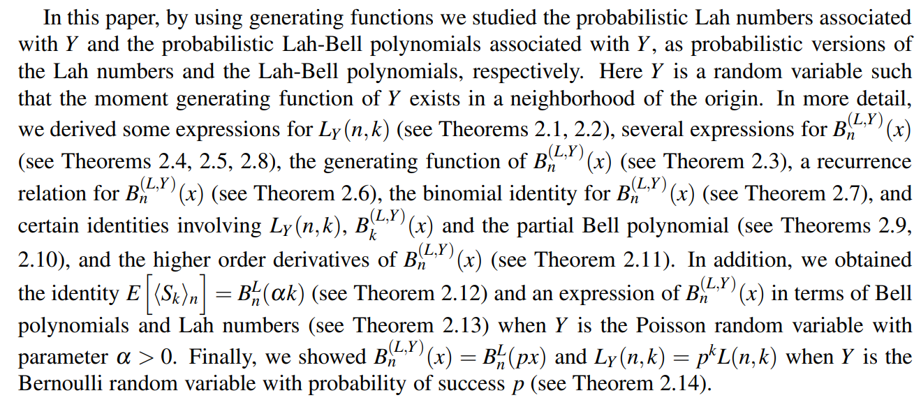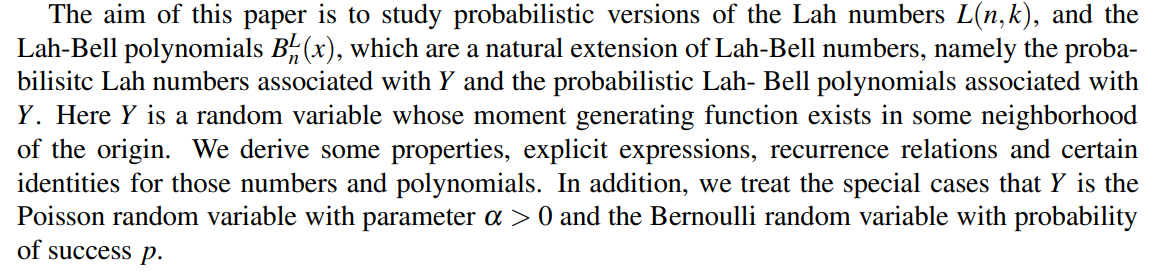 [12] Kim, D. S.; Kim, T. Lah-Bell numbers and polynomials. Proc. Jangjeon Math. Soc. 23 (2020), No. 4, 577-586.