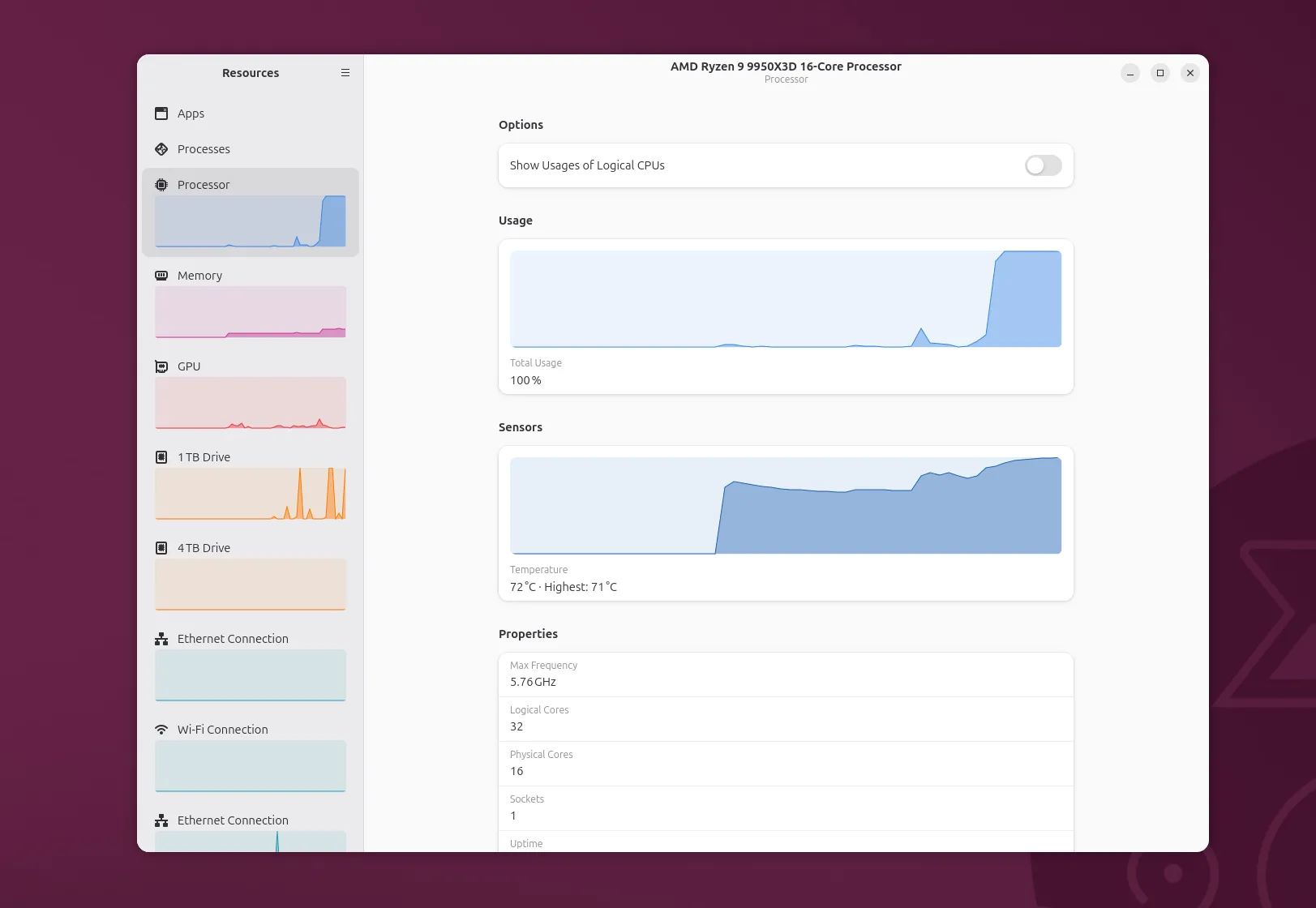 Resources 1.9 also now displays link information for WiFi interfaces, an uptime entry on the CPU view, power usage reporting improvements for some GPUs, detection of PCI Express 7.0 and PCI Express 8.0 speeds, and various other enhancements.