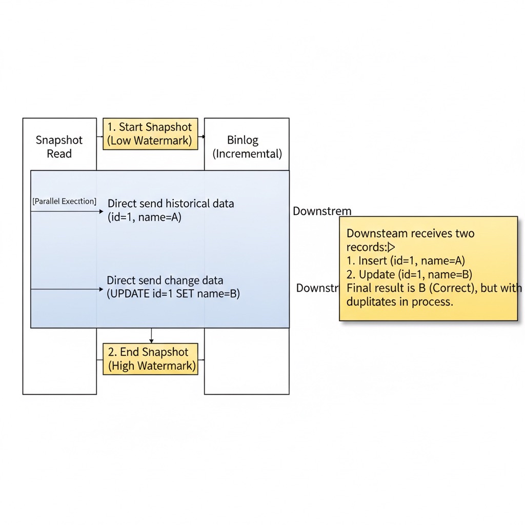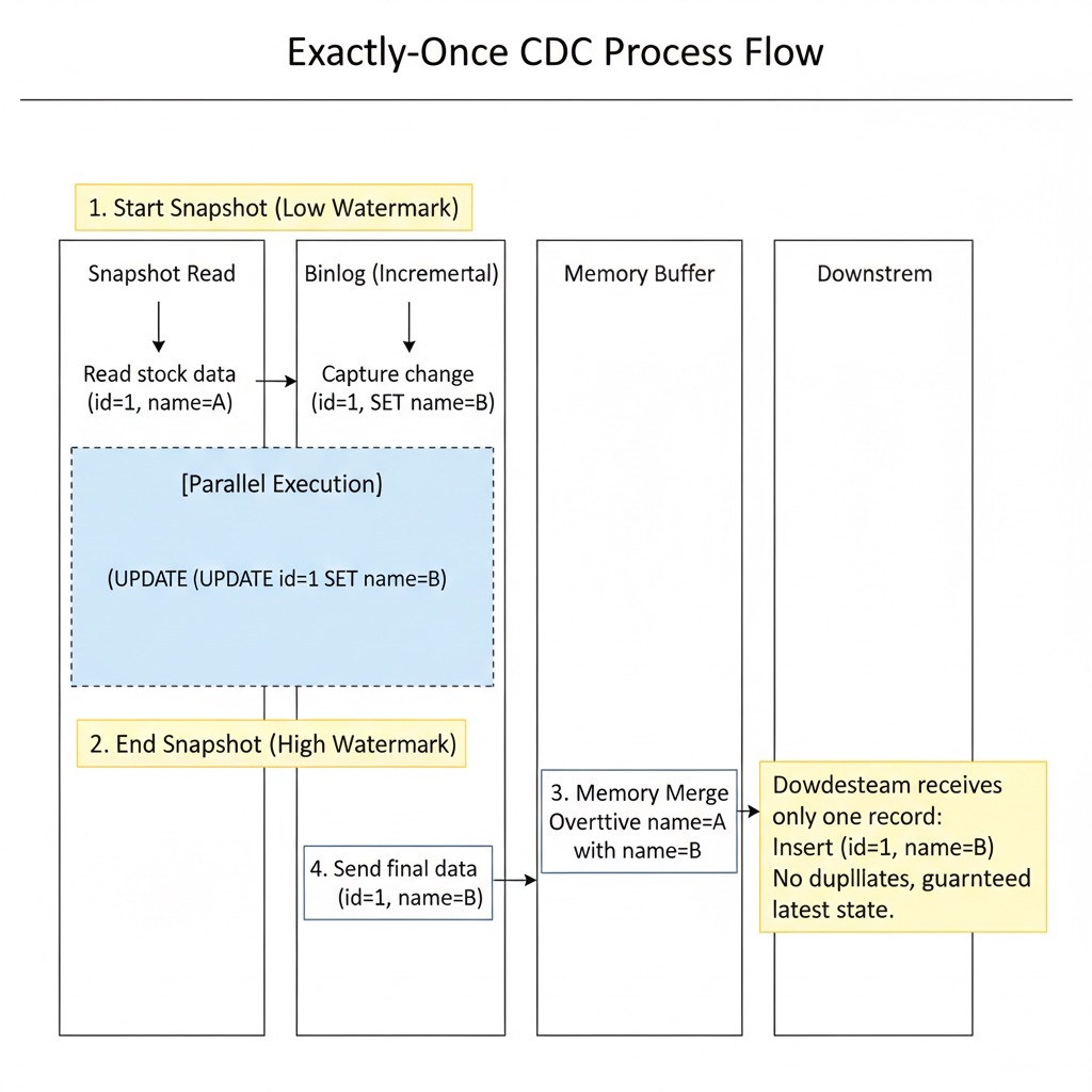 • Backfill is responsible for sewing the gaps: This is the most critical step. It compensates for changes during the snapshot and eliminates duplicates using memory merging algorithms to achieve Exactly-Once.