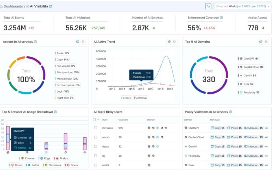• Complete AI Activity Visibility: Real-time monitoring of all AI interactions, including prompts, uploads, downloads, and agentic behavior.