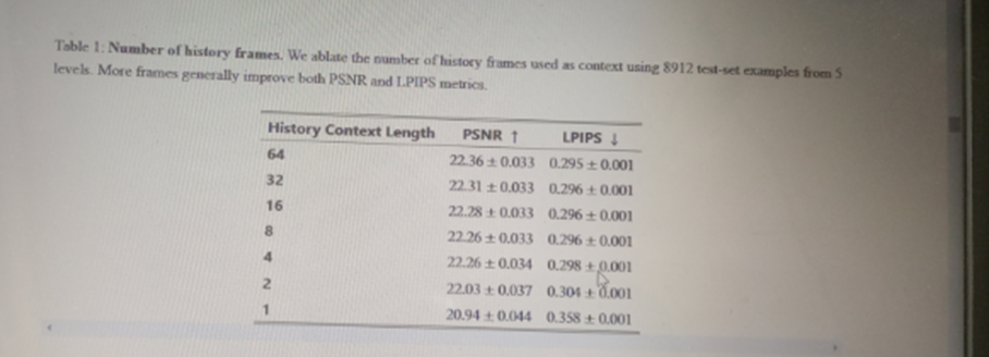 We evaluate the impact of changing the number N of past observations in the conditioning context by training models with N ∈ {1, 2, 4, 8, 16, 32, 64} (recall that our method uses N = 64). This affects both the number of historical frames and actions. We train the models for 200,000 steps keeping the decoder frozen and evaluate on test-set trajectories from 5 levels. See the results in Table 1. As expected, we observe that generation quality improves with the length of the context. Interestingly, we observe that while the improvement is large at first (e.g. between 1 and 2 frames), we quickly approach an asymptote and further increasing the context size provides only small improvements in quality. This is somewhat surprising as even with our maximal context length, the model only has access to a little over 3 seconds of history. Notably, we observe that much of the game state is persisted for much longer periods (see Section 7). While the length of the conditioning context is an important limitation, Table 1 hints that we’d likely need to change the architecture of our model to efficiently support longer contexts, and employ better selection of the past frames to condition on, which we leave for future work.