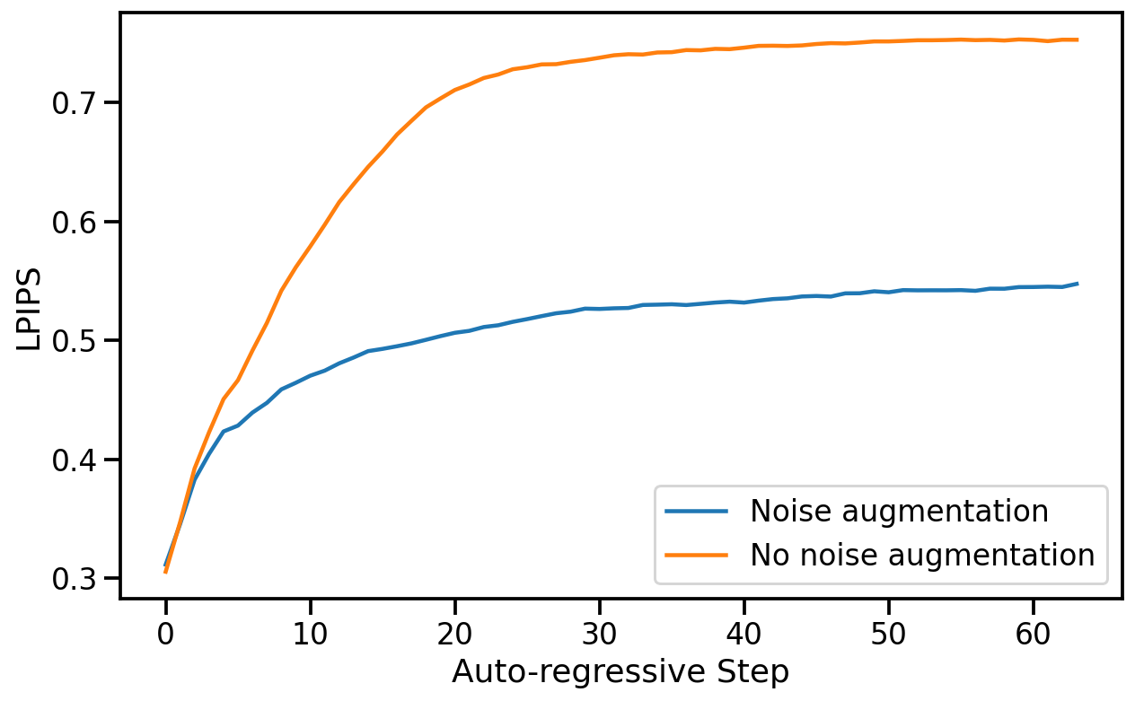Figure 7:Impact of Noise Augmentation. The plots show average LPIPS (lower is better) and PSNR (higher is better) values for each auto-regressive step. When noise augmentation is not used quality degrades quickly after 10-20 frames. This is prevented by noise augmentation.
