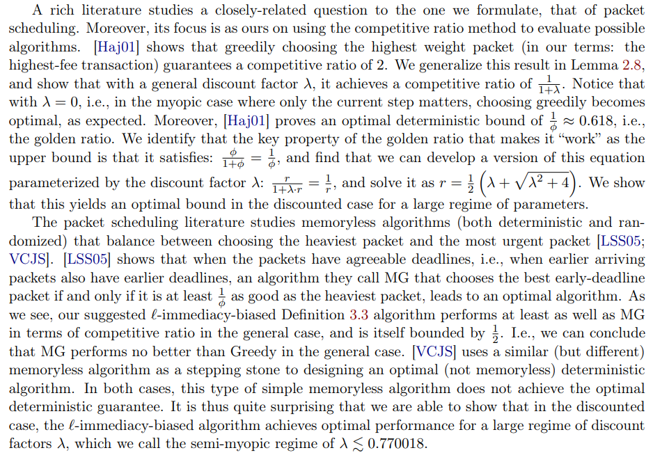 The literature of packet scheduling also considered randomized algorithms and upper bounds. [CCFJST06] suggested a randomized algorithm that works, similarly to MG, by considering the heaviest packet vs. the best early-deadline packet, but uses a randomized coefficient to determine which of them to choose. We show that [CCFJST06] can be generalized to depend on the discount factor. Our generalization is the same as RMIX when λ = 1, and the same as the greedy algorithm when λ = 0, where it achieves the optimal competitive ratio of 1. [BCJ11] extended RMIX analysis from the oblivious to the adaptive adversary, and also provided an upper bound for any randomized algorithm against the adaptive adversary. We show how to extend their construction to depend on the discount factor. An overview of the packet scheduling literature, including open problems in the field, can be found in [Ves21]. While we do not attempt to give a conclusive overview, we note that there is an alternative literature to that of packet scheduling with deadlines, that considers analysis of whether or not to accept packets to a FIFO queue, and there, a latency sensitive model was previously considered [FMN08].