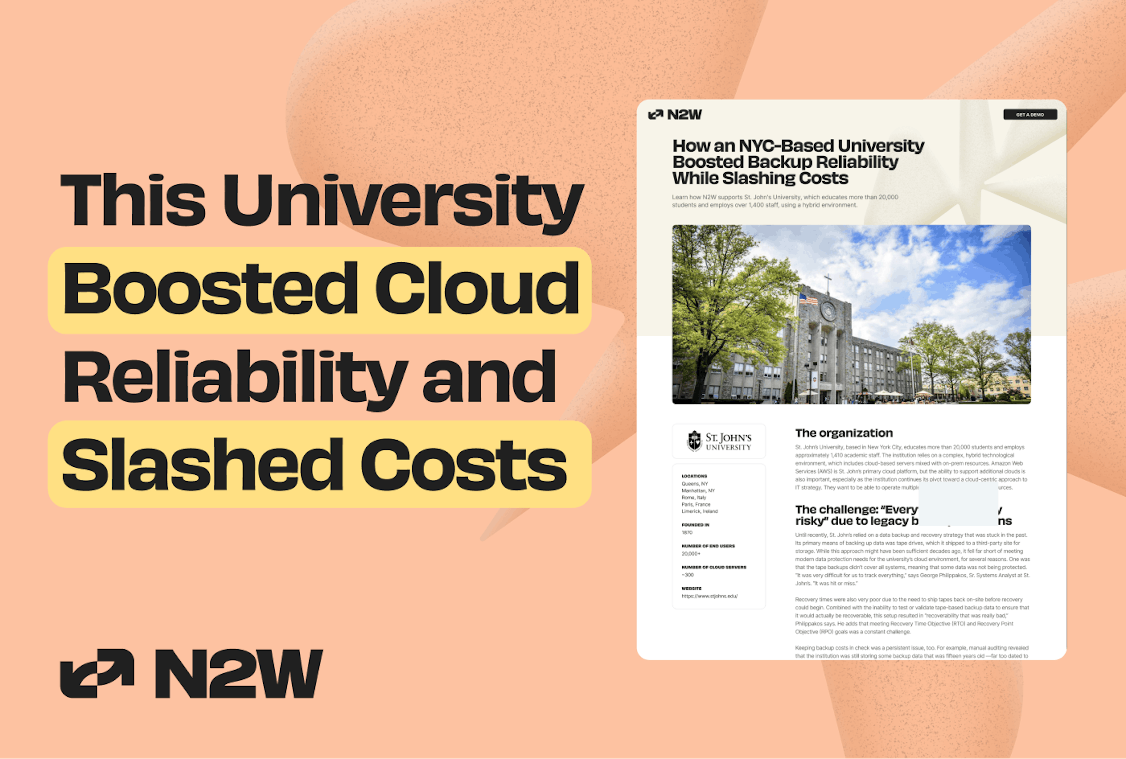 By @n2w [ 4 Min read ] Learn how N2W supports St. Johns University, which educates more than 20,000 students and employs over 1,400 staff, using a hybrid environment. Read More.
