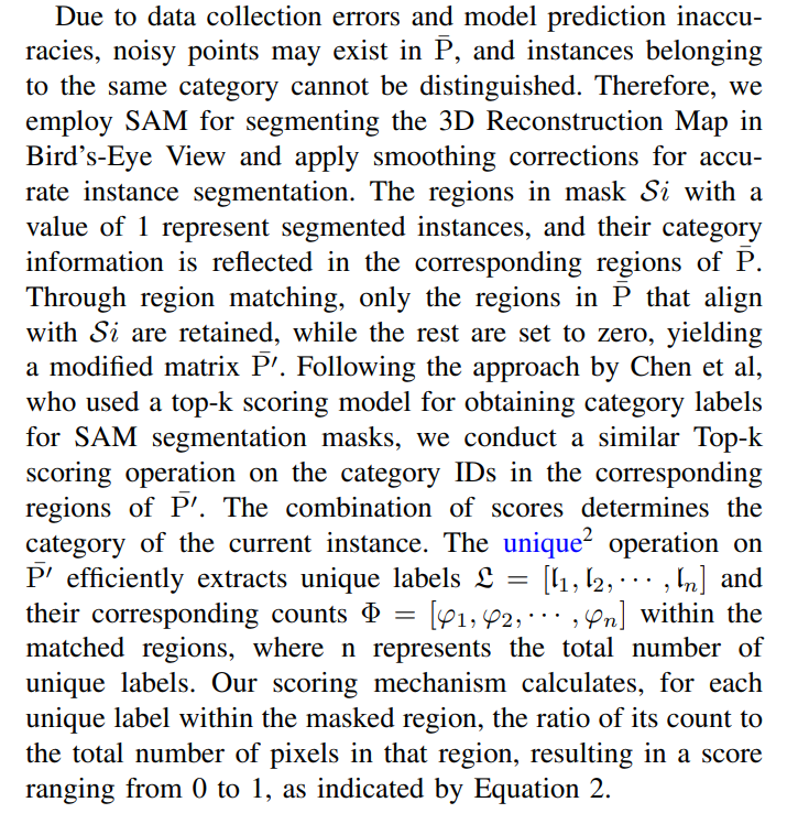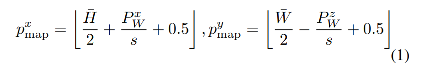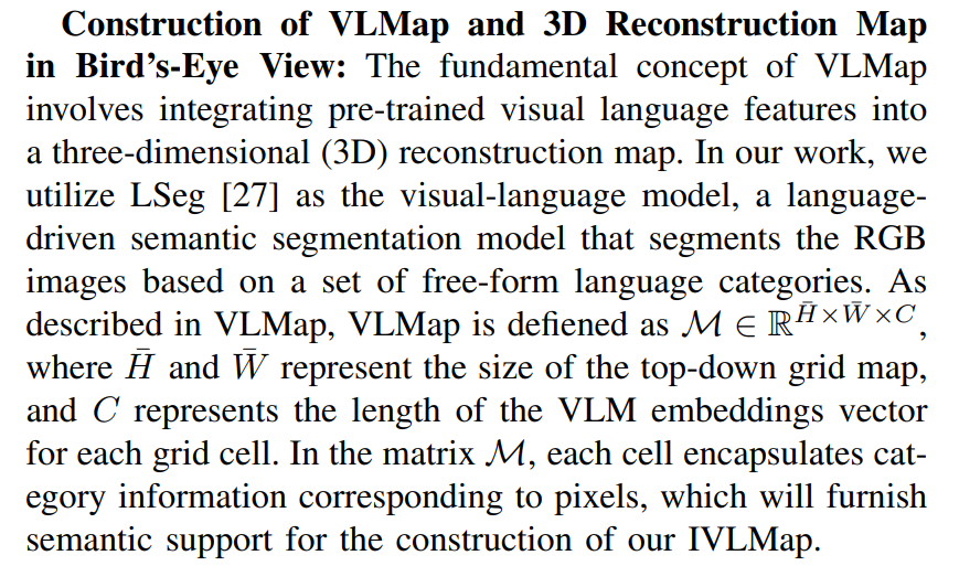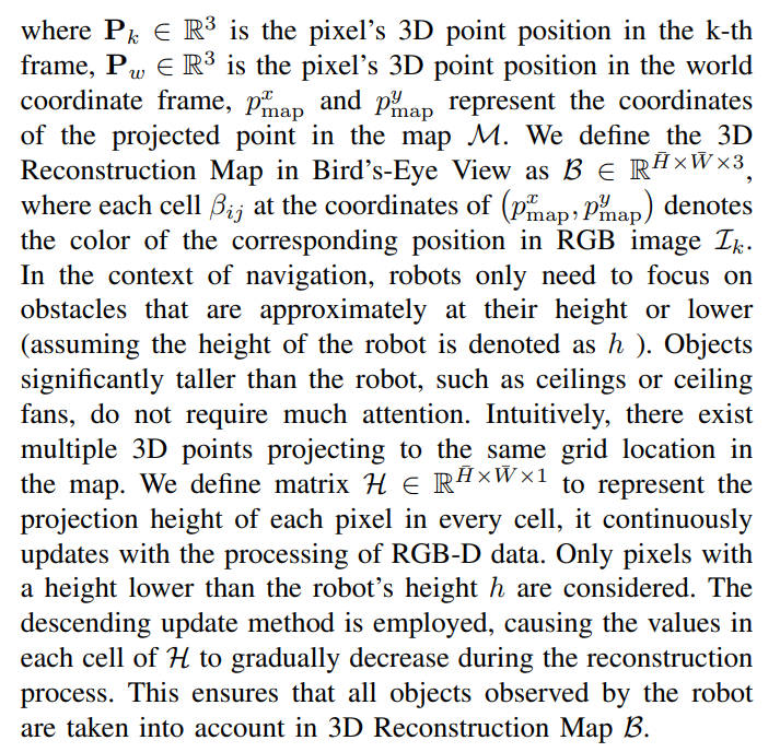 In order to get the 3D Reconstruction Map in Bird’s-Eye View, we, in line with the approach employed by VLMaps, obtain the corresponding coordinates of each pixel u in the RGB-D data frame within the grid map by formula