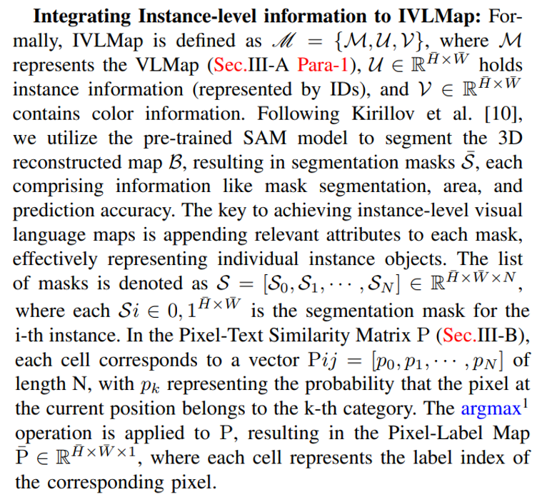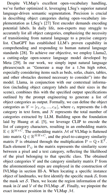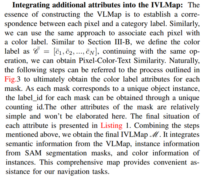 and attributes. Simultaneously, they are required to find ”where is the chair” by paying attention to the spatial relationship between the chair and the table. Our method is proposed based on VLMap [5]. In the following subsections, we describe (i) how to build IVLMap (Sec.III-A), (ii) how to use these maps to localize open-vocabulary landmarks (Sec.III-B), (iii) How to employ VLMaps in tandem with large language models (LLMs) to enable instance level object goal navigation using natural language commands (sec.III-C). Our pipeline is visualized in Fig.2.