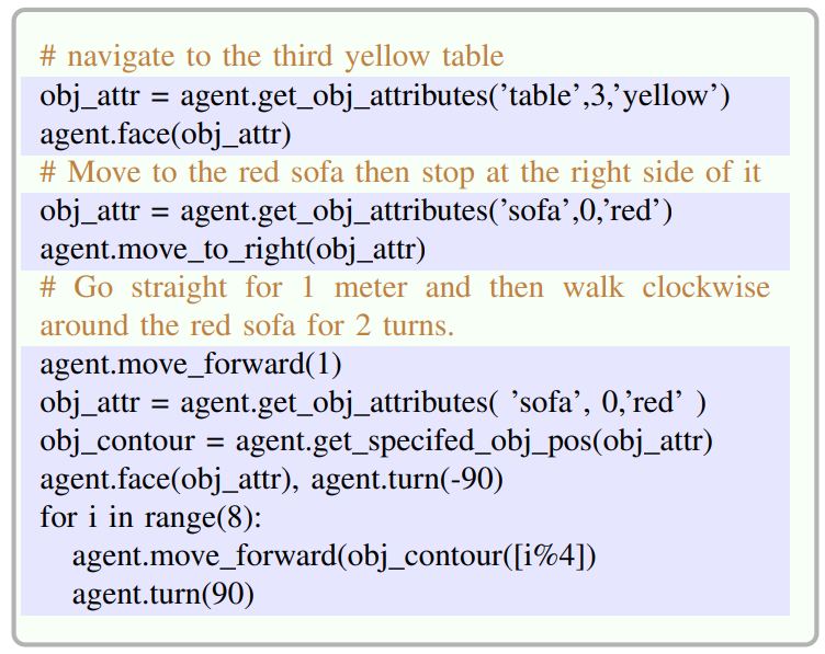 There are numerous outstanding works in the field of zeroshot navigation, such as CoW [30], LM-Nav [4], VLMap [5]. Unlike their approaches, IVLMap enables navigation to instances of objects with specific attributes, such as ”the third chair on the left” or ”the nearest black sofa”. Particularly, we employ a large language model (LLM) to interpret the given natural language commands and decompose them into subgoals with attributes including object name, object instance information, object color [4], [5], [31], [32]. We have established a comprehensive set of advanced function libraries tailored for IVLMap. Building upon the understanding of natural language commands by the LLM, these libraries are invoked to generate executable Python robot code [25], [33]. Additional mathematical computations may be performed if required. Below are snippets showcasing some commands and the Python code generated by the model(input command in blue, output Python code in black), the full prompt can be referred to in Appendix B.