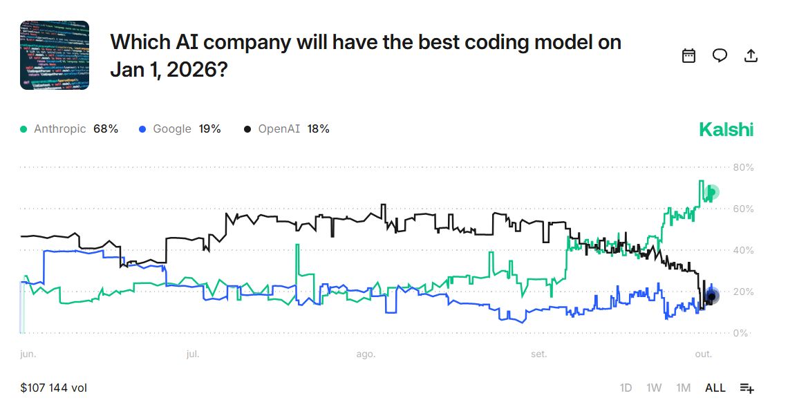 Meanwhile a cool $100,000 is riding on which AI company will have the best coding model on January 1, 2026, over at Kalshi. Anthropic is currently on the top spot, but who knows if Google could pull something out of the hat?