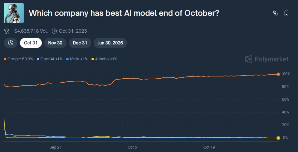 Last time around, we saw users on Polymarket betting on what the best AI model will be by the end of September. Well, we now have a similar bet for the best AI model by the end of October, with Google’s Gemini STILL the clear favorite.