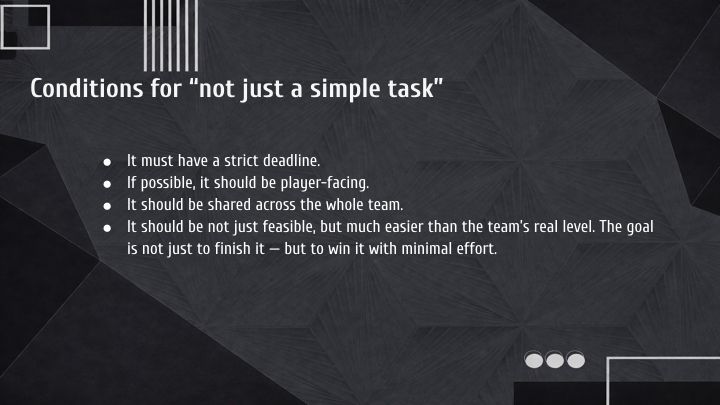 Ideally, this should not be an “internal” deadline, but an external one — something that, once announced to stakeholders or players, can no longer be easily moved. For example, an external playtest aimed at measuring specific product metrics (D7, D10, D30 retention) or testing a particular feature.