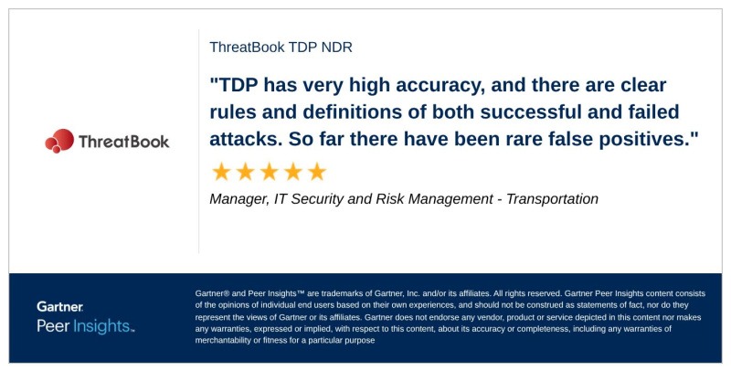 Full Review: https://www.gartner.com/reviews/market/network-detection-and-response/vendor/threatbook/product/threatbook-tdp-ndr/review/view/6145510
