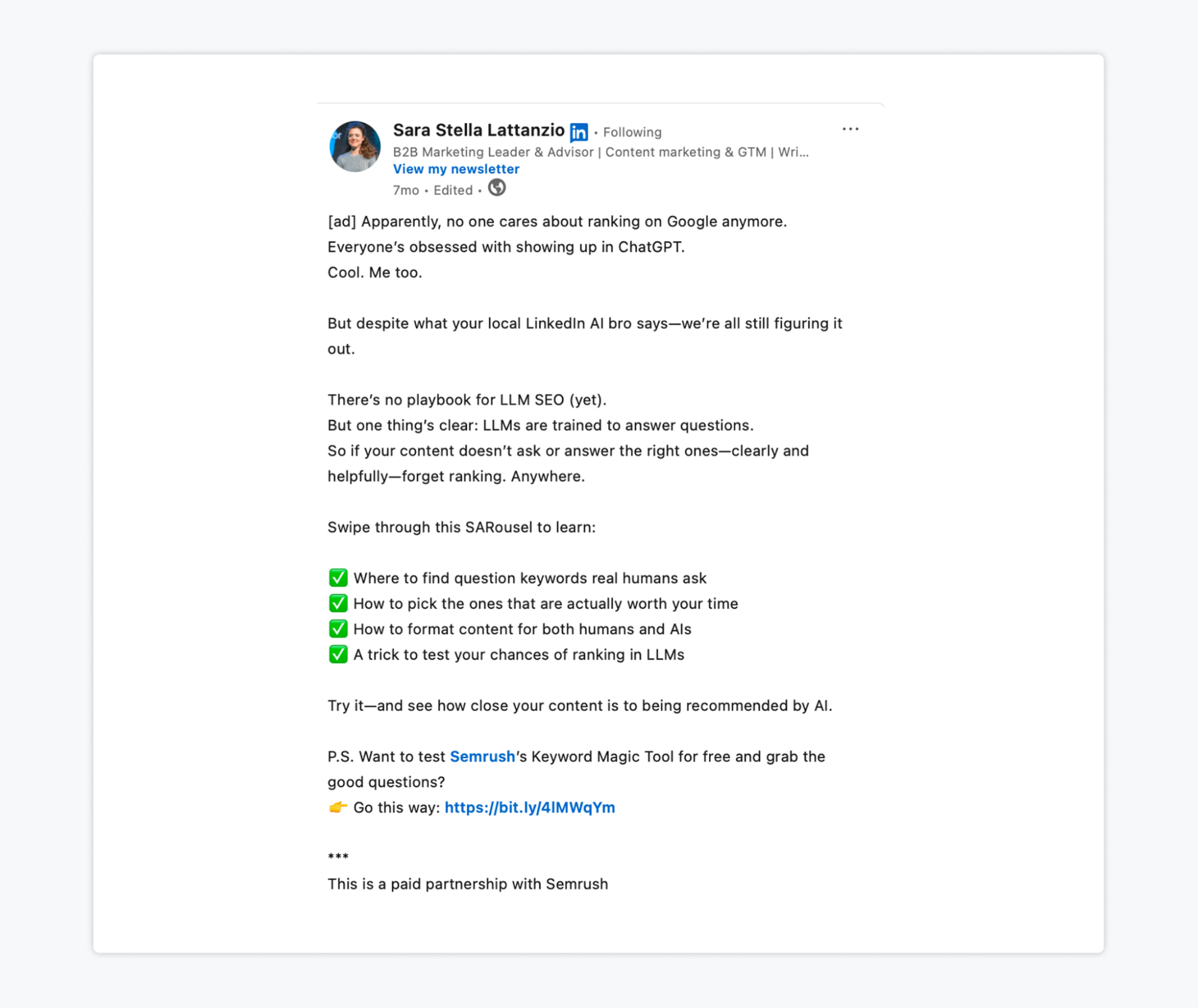 As polished ads become less effective, micro-influencer content offers a more genuine alternative. Their posts come across as real recommendations, which resonates well on the platform. Brands like Semrush, for example, are already testing the waters with micro-influencer marketing, and while the strategy may seem geared toward big companies, smaller brands can benefit too. The key is finding voices that align well with your brand.