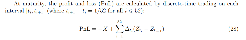 This experiment begins by shorting a European call option with maturity T. The derivative will be hedged by trading the underlying asset. A ∆ hedging strategy is considered, and the portfolio consisting of positions on the underlying is rebalanced weekly, according to the newly computed ∆ weights.