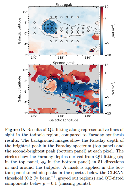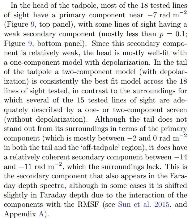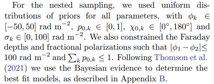 We note that the purpose of the models we chose to test was to confirm the Faraday depth values of the primary and secondary peaks in the spectra derived using Faraday synthesis. As we can see from large values of the Bayes odds ratios listed for the models in Appendix B, the ‘true’ description of the tadpole lines of sight is likely more complicated than this set of models.