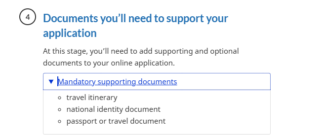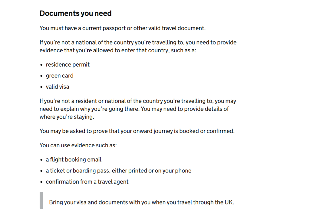 Screenshot of documents needed to apply for a transit visa, taken from the UK Government’s website.