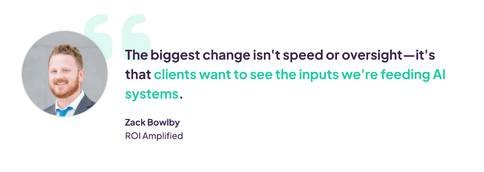 “The biggest change isn’t speed or oversight—it’s that clients want to see the inputs we’re feeding AI systems. They’re asking ‘what customer data did you train this on?’ and ‘show me the prompt architecture.’” – Zack Bowlby, CEO, ROI Amplified