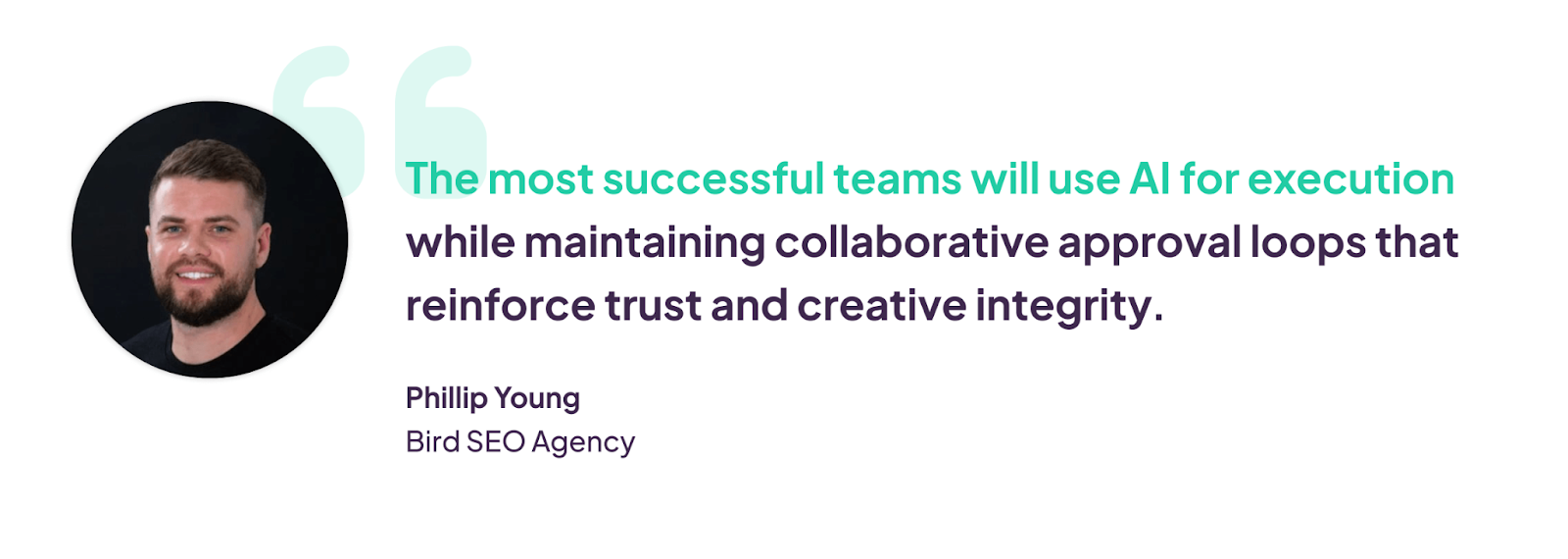 “By 2026, client approval and feedback processes will likely evolve into a hybrid model that balances speed with oversight. AI streamlines content creation, but clients expect greater human review to ensure brand accuracy, originality, and compliance. The most successful teams will use AI for execution while maintaining collaborative approval loops that reinforce trust and creative integrity.”– Phillip Young, CEO, Bird SEO Agency UK