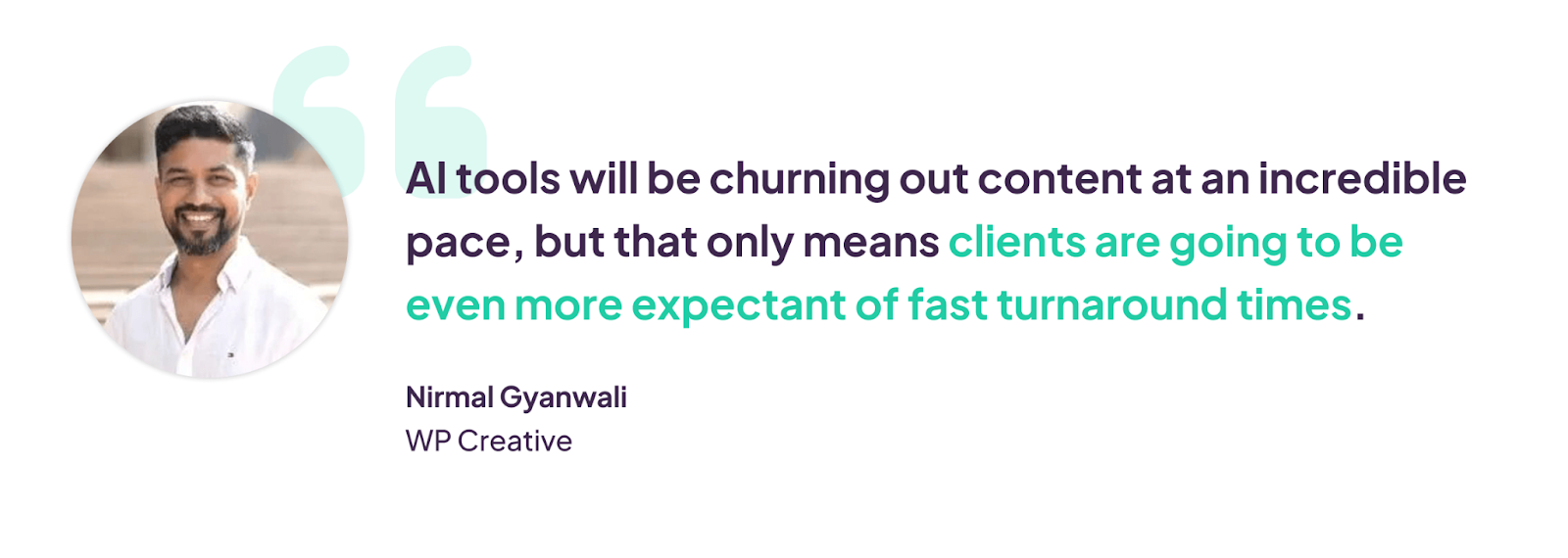 According to Nirmal Gyanwali, Founder & CMO, WP Creative, the broader use of AI tools will push clients to expect even quicker delivery as a baseline: