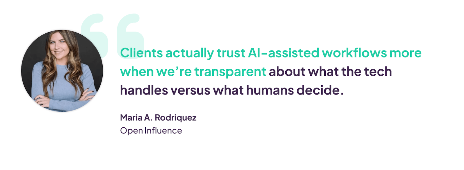 “We now build AI guardrails that catch things like wrong product angles or missing FTC disclosures before human review. What surprised me most? Clients actually trust AI-assisted workflows more when we’re transparent about what the tech handles versus what humans decide. That honesty eliminates the ‘did a robot write this?’ anxiety and keeps approvals moving.” – Maria A. Rodriguez, VP, Comms and Marketing, Open Influence