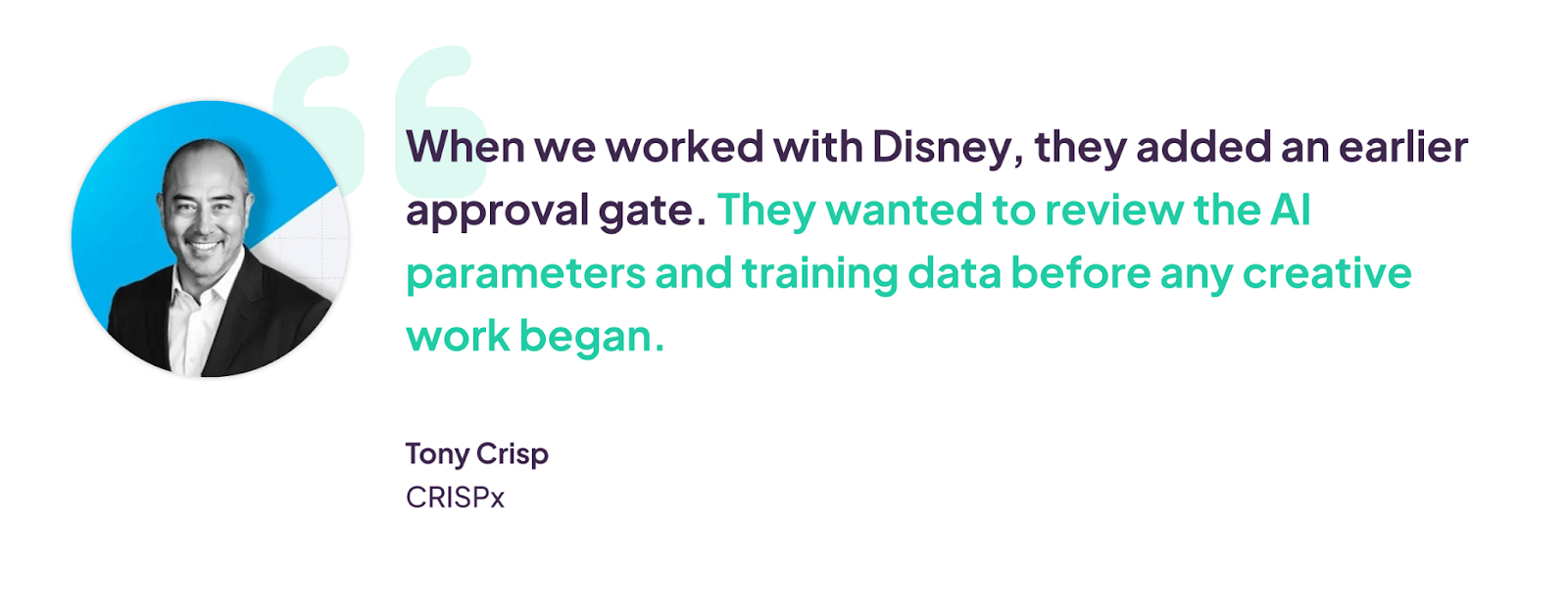 “AI completely changed when approval happens in the process, not just how fast. When we worked with Disney, they added an earlier approval gate. They wanted to review the AI parameters and training data before any creative work began.” – Tony Crisp, CEO & Co-Founder, CRISPx