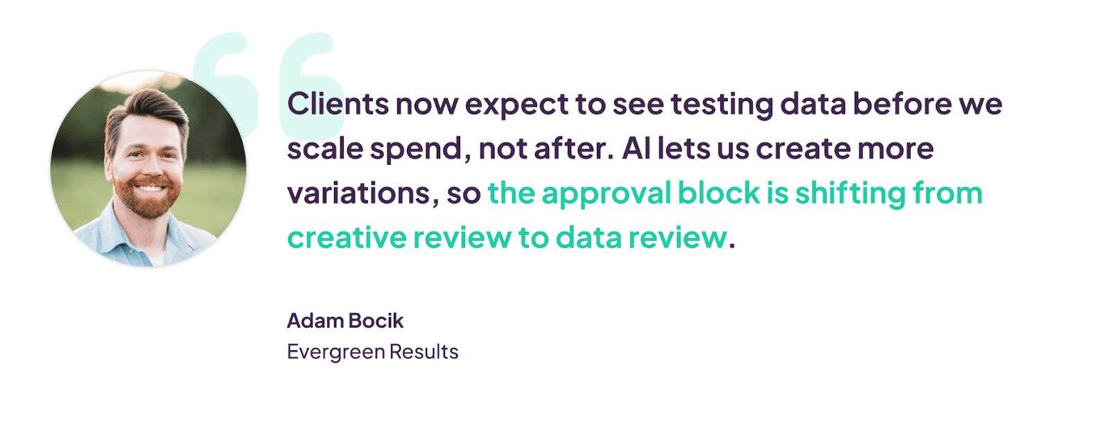 “Clients now expect to see testing data before we scale spend, not after. AI lets us create more variations, so the approval block is shifting from creative review to data review. The change is that clients want to approve the insights driving the content, not just the content itself.” – Adam Bocik, Partner, Evergreen Results