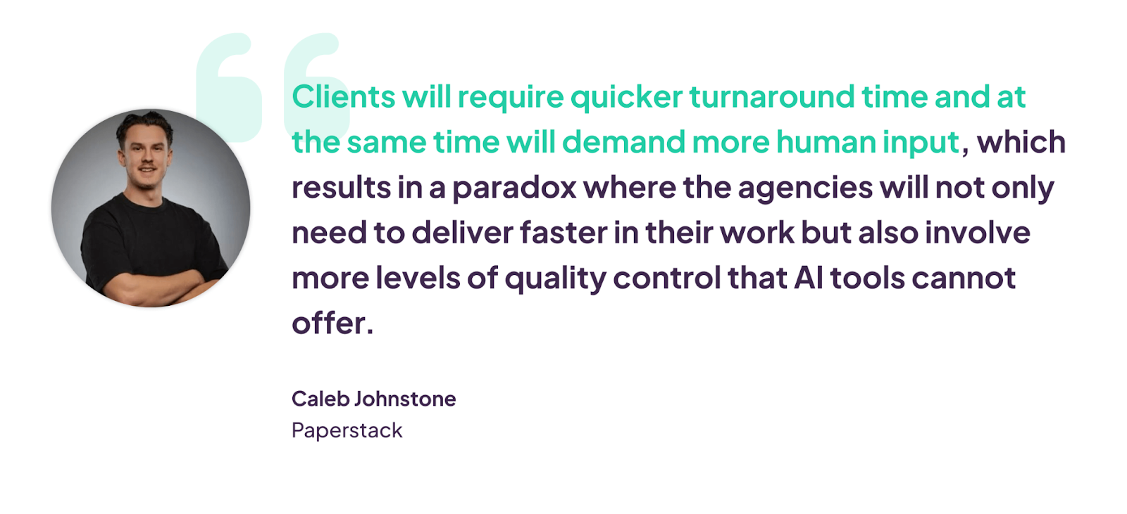 “Clients will require quicker turnaround time and, at the same time, will demand more human input, which results in a paradox where the agencies will not only need to deliver faster in their work but also involve more levels of quality control that AI tools cannot offer. This is already evident in the relationship with clients who want 48-hour content delivery due to the ability of AI to create drafts immediately, but demand 3-stage human review procedures due to a lack of trust in the accuracy of AI and consistency of brand voice.