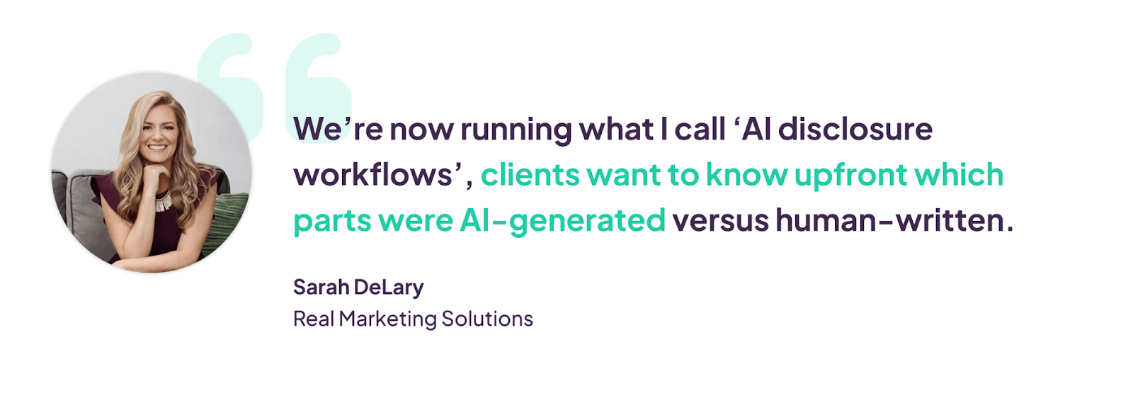 “What I’m seeing in real-time with our clients is that the approval process is actually splitting into two distinct tracks that didn’t exist before. We’re now running what I call ‘AI disclosure workflows’; clients want to know upfront which parts were AI-generated versus human-written. One of our government agency clients now requires us to submit an AI usage report alongside every deliverable.” – Sarah DeLary, Owner, Real Marketing Solutions