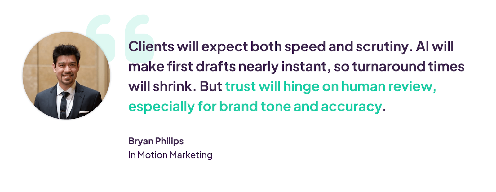 “Clients will expect both speed and scrutiny. AI will make first drafts nearly instant, so turnaround times will shrink. But trust will hinge on human review, especially for brand tone and accuracy. Agencies that pair AI efficiency with transparent human oversight, showing what was automated and what was refined, will set the new standard for client confidence.” – Bryan Philips, Head of Marketing, In Motion Marketing