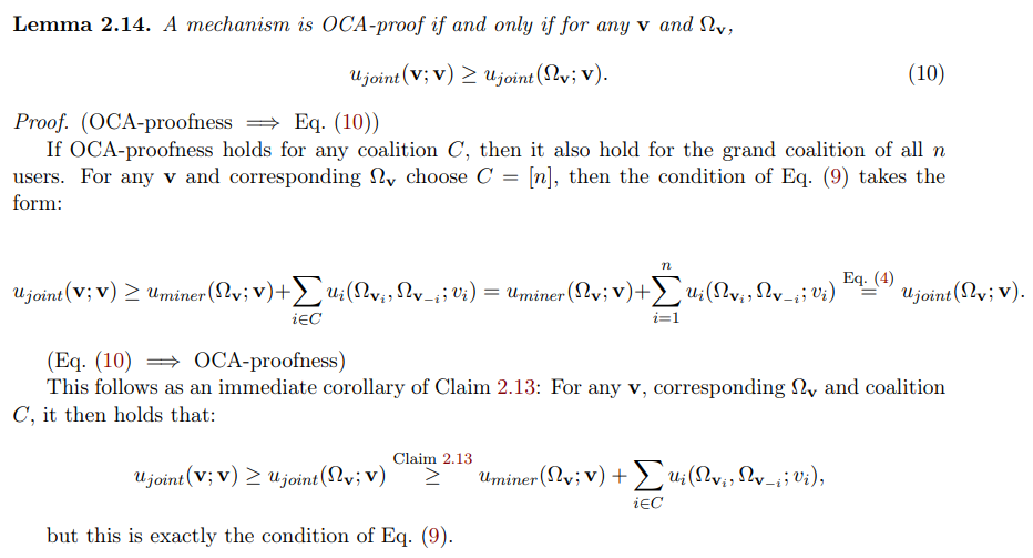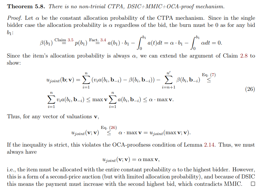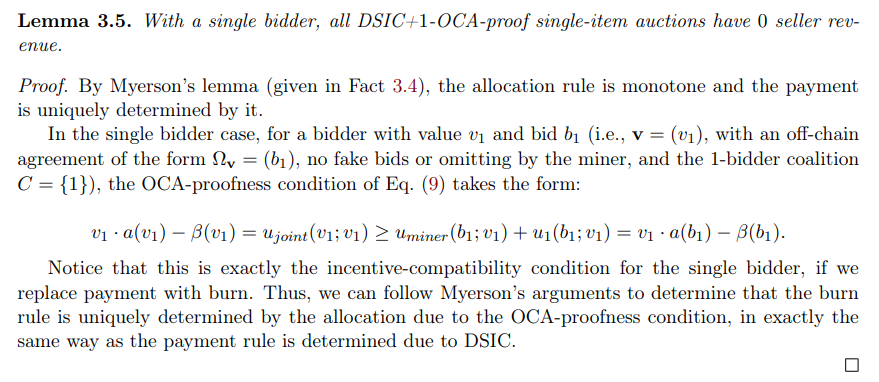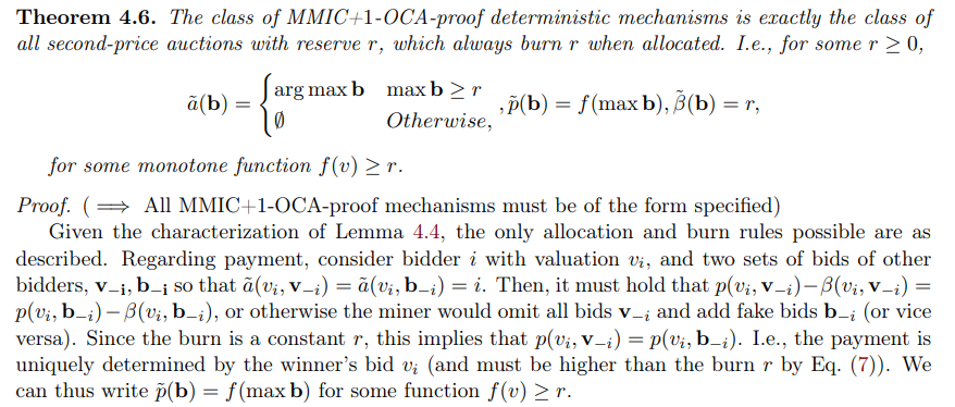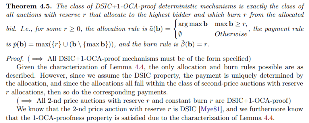 Our characterization of DSIC+1-OCA-proof and MMIC+1-OCA-proof mechanisms extends known incidental results in the literature. For example, Table 1 in [Rou21] notes that the first price auction is MMIC+1-OCA-proof, the second-price auction is DSIC+1-OCA-proof, and that EIP-1559 (which is essentially a first-price auction with a dynamically adjusted burned reserve price) is MMIC+1-OCA-proof. Our characterization confirms these results, but also precisely extends them: In essence, it shows that all MMIC+1-OCA-proof are “EIP-1559 – type” mechanisms, in the sense of having a threshold bid r and a constant burn, albeit with the freedom to choose any monotone payment function and not necessarily first-price payments. Similarly, for DSIC+1- OCA-proof mechanisms, any second-price auction with a constant burn is possible. These results are made more important by our impossibility result (Theorem 4.7), since if all requirements cannot be satisfied at once, satisfying at least two of the three may be a good compromise.