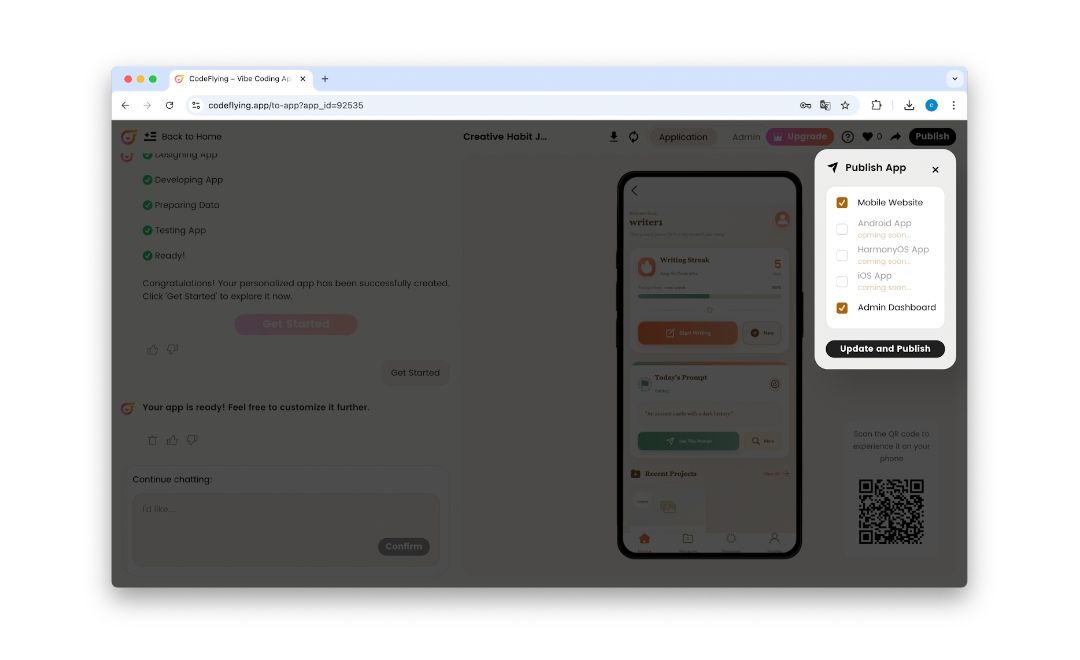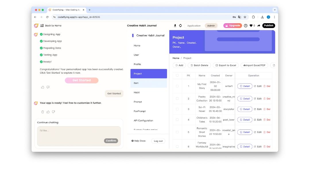 Every app created through CodeFlying also has a unique management back-end. The AI-native backend automatically sets up a database, authentication, APIs, and context management using automatic code generation.