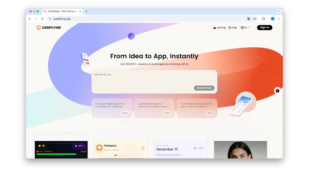 CodeFlying stands out with its natural language interface, allowing anyone to build functional apps without writing code. Unlike many competitors, it offers built-in publishing tools and access to full source code, making it easy for both beginners and experienced developers to bring their ideas to life.