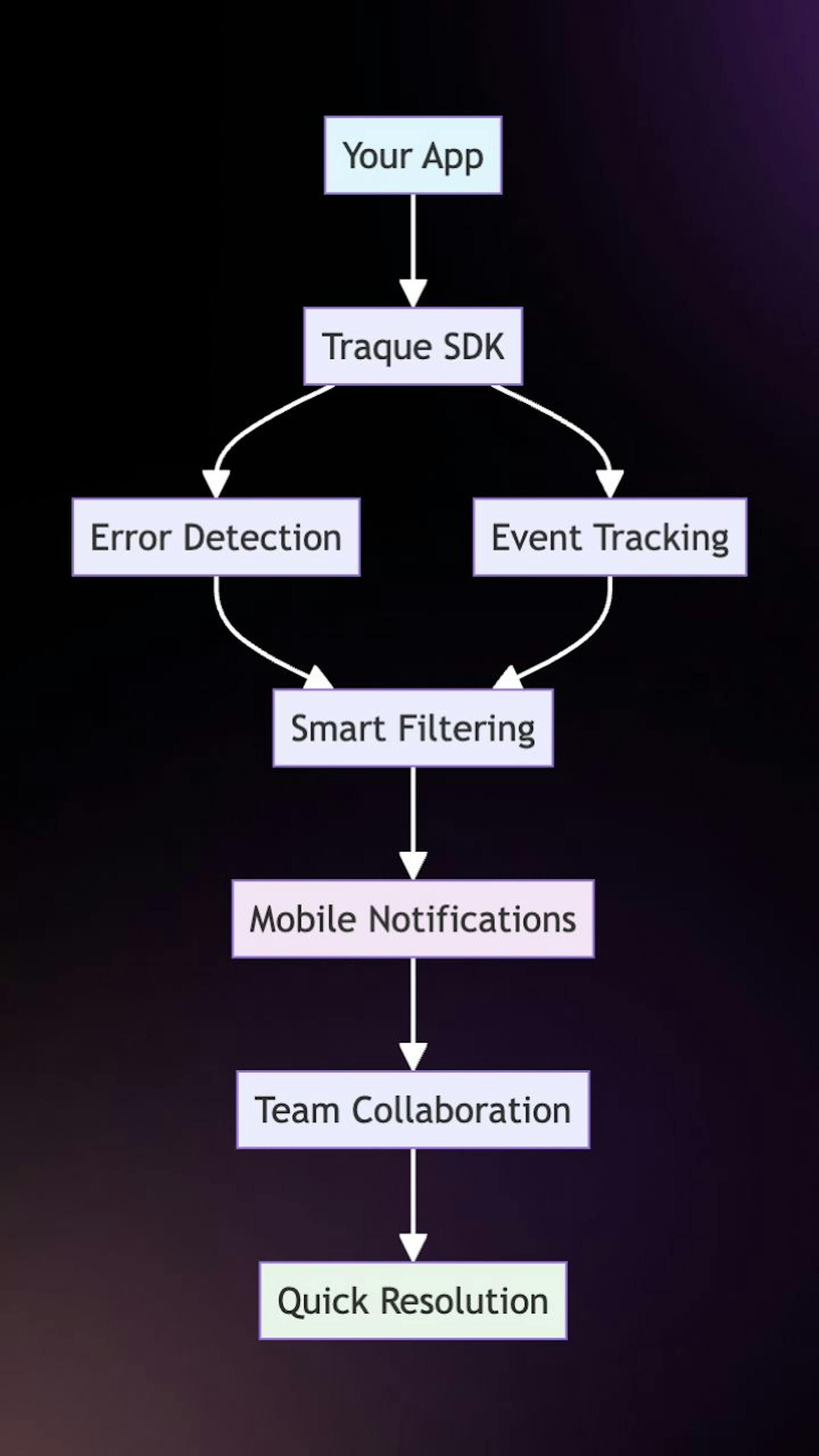 This simple flow shows how Traque captures issues, filters out noise, and gets the right information to your team instantly