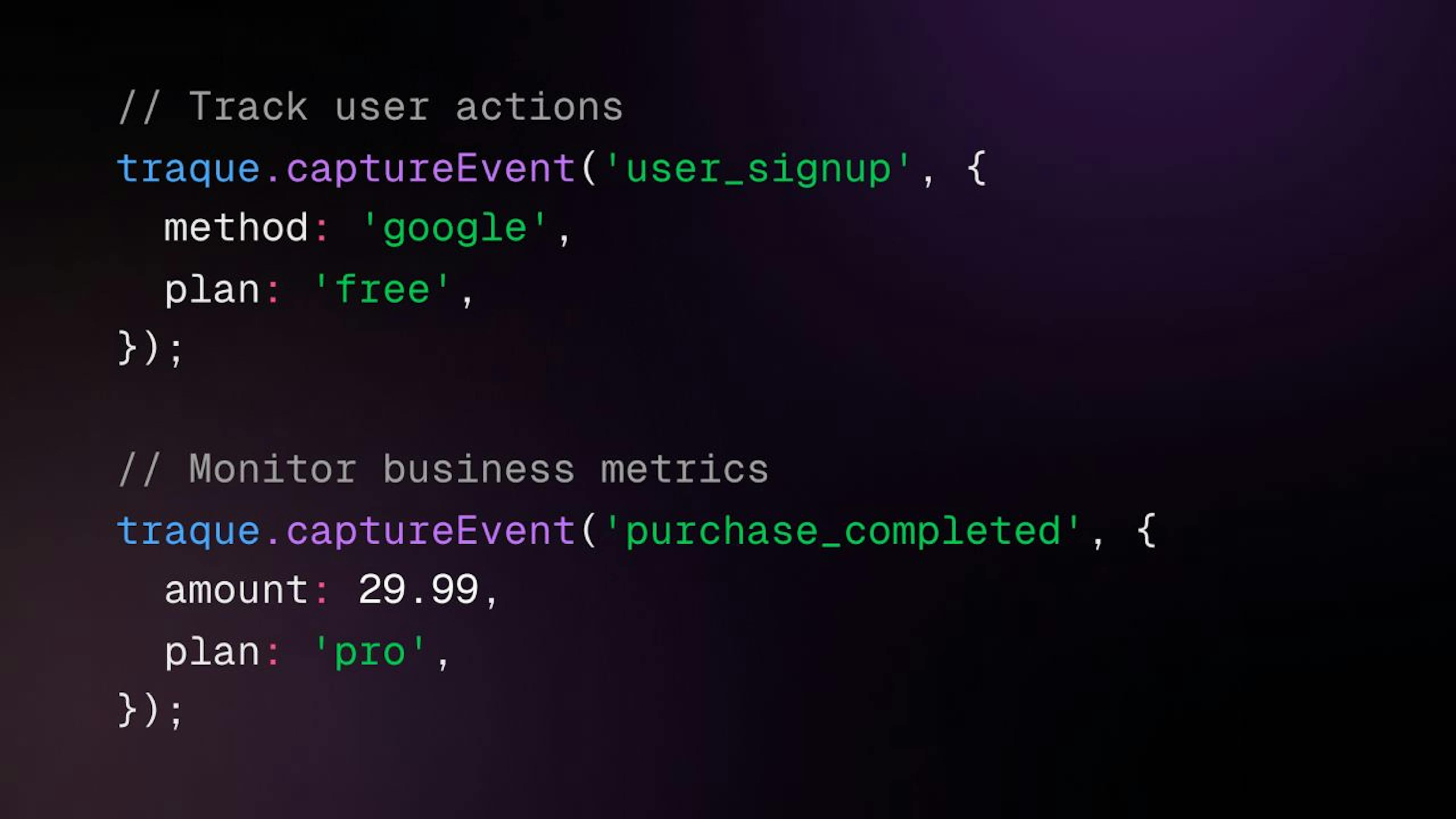 Beyond just catching errors, Traque lets you track any event that matters to your business: