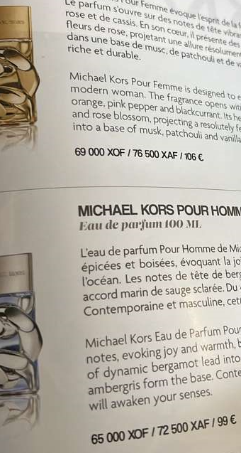 Chaque produit suivait ce format : prix en XOF, puis en XAF, puis en euros… comme si le XOF et le XAF n’avaient pas exactement la même valeur par rapport à l’euro. Je vous laisserai déterminer lequel des deux se rapproche le plus de la valeur réellement indexée.