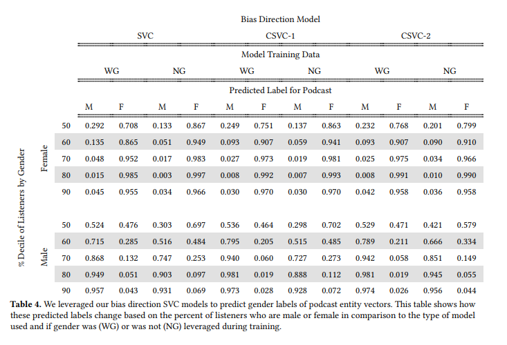 this relationship is embedded into the space would require more in-depth testing with non-binary data, which is out of the scope of this paper but could be an interesting development to explore in future research. We found that this classification scenario showcased how podcast entity vectors can capture user gender attribute association bias based on the increase in accuracy in predictions as the percentage of listener gender rose. Additionally, the results showed that podcast embeddings associated with male listening experienced a sharper increase in accuracy as the male listener percentage increased. This finding is helpful during evaluation because it flags a difference in behavior within the latent space for podcast embeddings more related to stereotypical male listening.