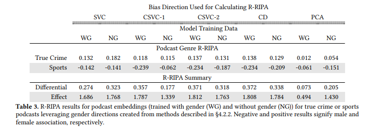 stand out. First, after removing gender, the SVC R-RIPA for true crime podcasts increased, signifying an increase in attribute association bias for true crime podcasts with female users. However, this result is not present for R-RIPA created with the bias directions CSVC-1, CSVC-2, and CD. This difference signals that user gender attribute association bias may have a more nuanced relationship with individual female users that is not fully captured by centroid-based directions. Additionally, we find that true crime podcasts do not experience as significant of a decrease as sports podcasts for R-RIPA calculated with the bias directions CSVC-1, CSVC-2, and CD. This result could signify that removing user gender reduced attribute association bias more heavily for sports podcasts with high levels of attribute association bias as captured by a centroid-related direction.