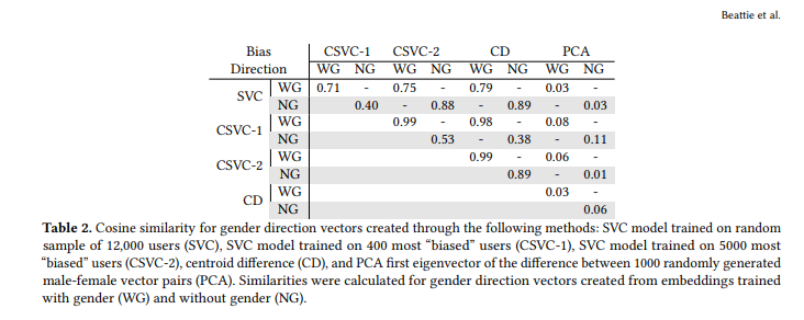 atent space. Finally, the reduced accuracy of the CSVC-1 model with no gender may signal that the resulting bias direction may not be best for calculating bias metrics or analyzing attribute association bias. It would be more prudent to leverage bias directions with high levels of significance via testing and high levels of accuracy (when using SVC to create the bias direction). We calculated the cosine similarity between each possible direction vector to compare the resulting bias directions. The cosine similarities between the different gender directions reflected in with-gender and non-gender embeddings can be found in Table 2. Our comparisons signaled high levels of similarity between all calculated gender directions except for the PCA bias direction.