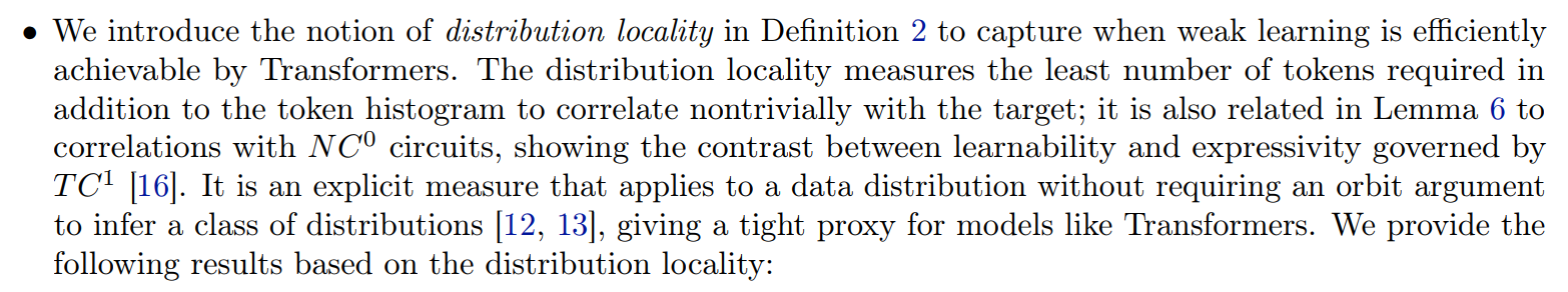 – A general conjecture (Conjecture 1), backed by experimental results, that claims efficient weak learning is achievable by a regular Transformer if and only if the distribution locality is constant.