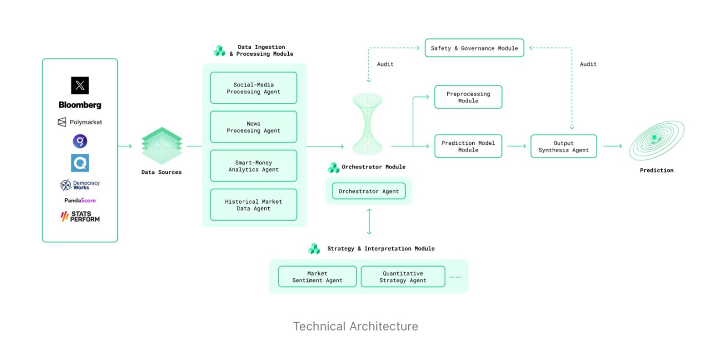 The Strategy and Interpretation Module converts model outputs into actionable insights through specialized agents. The Quantitative Strategy Agent applies trading heuristics. The Market Sentiment Agent weighs behavioral factors. The Output Synthesis Agent packages everything into interpretable probability estimates. A Safety and Governance Agent enforces rules and compliance constraints across all decision flows. The entire system exposes its capabilities through MCP-compatible APIs for programmatic access and bot interfaces on Telegram and X.