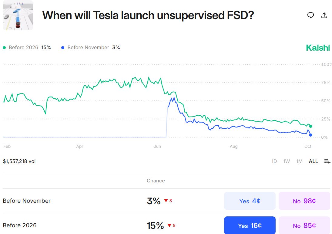 Users of Kalshi don’t have a lot of faith that Tesla, one of the most well-known car companies in the world, will be able to launch a fully autonomous self-driving car by the end of the year. According to the bet, there’s only a 15% chance of Tesla releasing an unsupervised FSD before 2026.