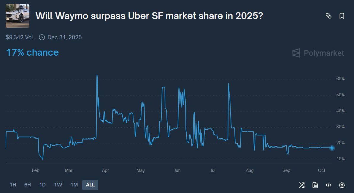That’s why on Polymarket, people have it at a 17% chance that Waymo will be able to match or beat Uber in the city of San Francisco. Only time will tell if they’re correct.