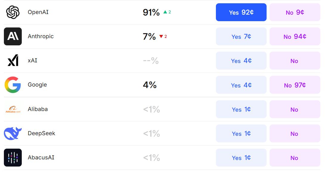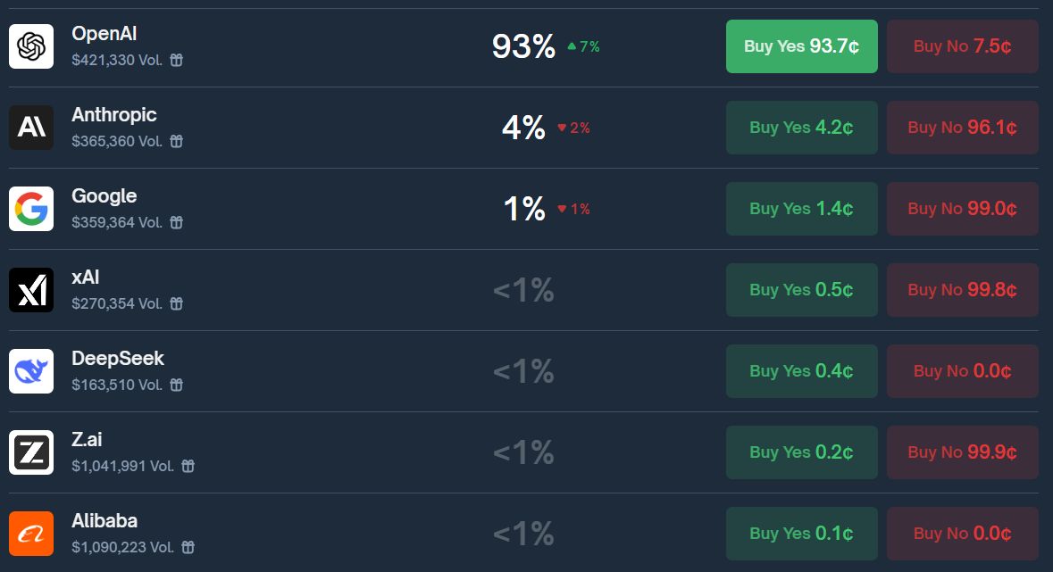 93% of Polymarket voters believe that OpenAI will have the best AI model for coding by the end of December 2025. Anthropic is the next best with 4%. Google is in third place with 1%, and every other company after that is under 1%.